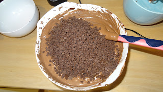 Numa taça maior, bater a manteiga com o açúcar e quando a mesma estiver cremosa e esbranquiçada, adiciona-se o interior da vagem de baunilha e os ovos 1 a 1 mexendo bem entre cada adição. Quando estiver tudo bem incorporado adiciona-se 1/3 da farinha e em seguida 1/2 da mistura do chocolate, adiciona-se outro 1/3 da farinha, 1/2 do chocolate e finalmente a restante farinha, mexendo bem para que fique tudo bem ligado. No final envolvem-se as pepitas de chocolate com uma espátula.